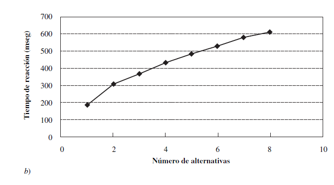 Los resultados finales mostraron una relación lineal entre el tiempo de procesamiento de la información (cableado simulado o colocación) y la complejidad de la información de la entrada (vea la figura 7.6). Mediante el uso de la ley Hick-Hyman, esta relación puede expresarse como